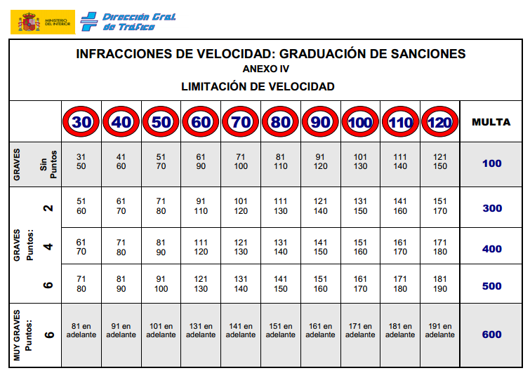 A continuación adjuntamos cuadro de infracciones de velocidad en función de la graduación de las sanciones.